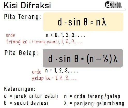 Demikianlah tadi ulasan rumus jarak pita terang dan gelap pada kisi difraksi yang berturut-turut sesuai dengan persamaan d · sin θ = nλ dan d · sin θ = (n ‒ ½)λ . Terima kasih sudah mengunjungi idschool(dot)net, semoga bermanfaat!